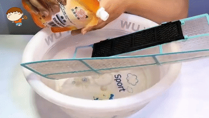 第二步:温水打湿后,可用中性洗衣液清洗。清洗时最好不要用刷子刷过滤网,以免把网眼刷大。
