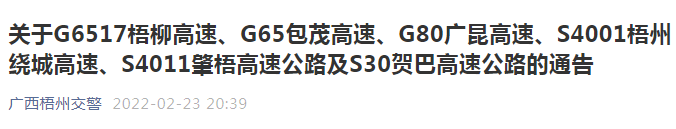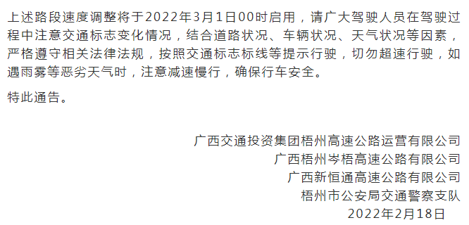 3月1日00时起,调整G6517梧柳高速K0+000至K59+600段等路段的限制速度,具体如下: