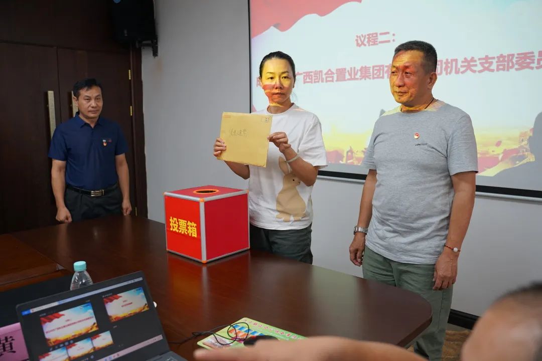 2022年7月1日,在革命老区东兰县,广西凯合集团党总支部全体党员针对上半年的党建工作进行了总结,同时每一位党员也投出了神圣的一票,选举产生了中共广西凯合置业集团有限公司机关支部委员会,党员龙谞簇同志荣任第一届机关支部书记,隆凯妮同志荣任机关支部副书记,梁君宝同志荣任机关支部纪检委员,黄翔宇同志荣任机关支部组织委员,吴雪芳同志荣任机关支部宣传委员!
