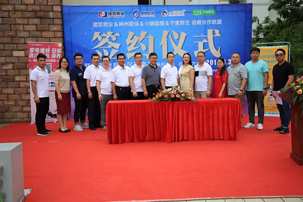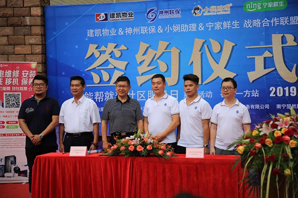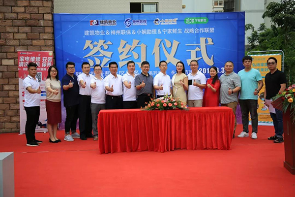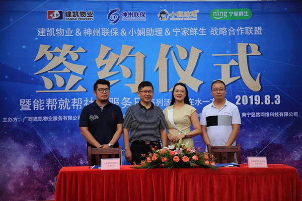 2019年8月3日下午,广西建凯物业服务有限公司协同广州市神州联保科技有限公司、小娴助理电子商务有限公司、威宁集团旗下所运营的品牌—宁家鲜生三大品牌公司在凤岭·在水一方小区举行了隆重的合作签约仪式,四家公司将合力打造“能帮就帮”智慧社区服务平台,率先成为广西打造智慧社区的标杆典范。