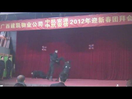 当天下午15时团拜会正式开始,团拜会共分四个部分进行,首先由公司常务副总经理周虹妤代表公司领导班子做了公司2011年度工作总结及2012年工作计划,简要回顾了建凯物业2011年的主要工作和所取得的业绩,为公司服务品质再上台阶打下了坚实的基础。展望建凯物业在新的一年里,继续围绕“贯彻落实公司三级培训,提升物业服务品质,积极拓展经营新思路”为工作主题,实现公司稳定健康发展。团拜会第二部分是对2011年度在平凡工作岗位上作出不平凡业绩的177名优秀员工进行表彰和嘉奖。在第三部分的文艺汇演中,舞台灯光璀璨,表演者热情高涨,展示了建凯物业人朝气蓬勃、积极向上的良好精神风貌。林业新村物业服务中心防范精英们带来的“擒敌格斗术”激情高昂,表演者拳脚有力,步伐稳健,动作一气呵成、势如破竹,将擒敌术力与美、行与神的完美结合展现得淋漓尽致,将团拜会推向了高潮。