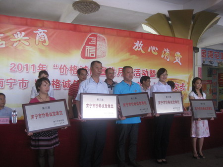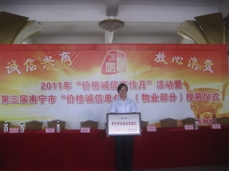 2011年9月28日上午,南宁市物价局“2010价格诚信宣传月”活动暨第三届南宁市“价格诚信单位”授匾仪式在金湾花城会所举行。我公司所属的商务厅桃源大院物业服务中心在有物业服务企业参加的首次参评的第三届南宁市“价格诚信单位”评比活动中,荣获了“价格诚信单位”荣誉。
