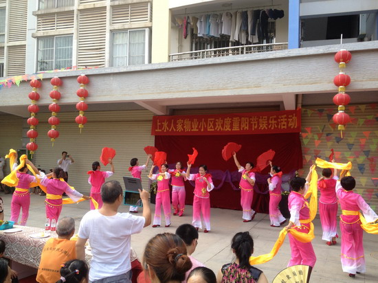 2013年10月13日,是中国传统的“重阳节”,也是温馨的“老人节”,尊老、敬老是我们中华民族的传统美德,南宁市上水人家物业服务中心每年都组织小区的老人们聚在一起,举办重阳节娱乐活动。当天,上水人家小区的老人们又一次聚在了一起,话话家常,一起欣赏老人们带来的丰富多彩的文艺节目,老人们多才多艺,他们优美的舞姿,不断赢得台下一阵阵热烈的掌声和欢笑,活动现场其乐融融。