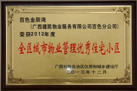 建凯物业百色分公司金辰湾小区被评为“全区城市物业管理优秀住宅小区”