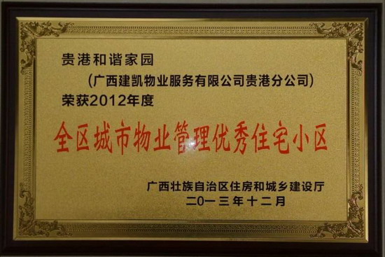 建凯物业贵港分公司和谐家园小区被评为“全区城市物业管理优秀住宅小区”