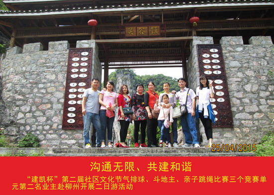 沟通无限、共建和谐 “建凯杯”第二届社区文化节气排球、斗地主、亲子跳绳比赛三个竞赛单元第二名业主于2015年4月25日至26日赴柳州开展二日游活动。