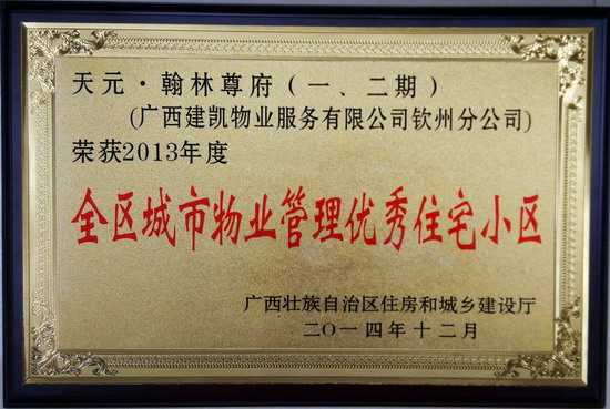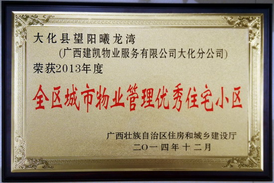 建凯物业大化分公司望阳曦龙湾小区、钦州分公司天元•翰林尊府小区荣获2013年度“全区城市物业管理优秀住宅小区”荣誉称号