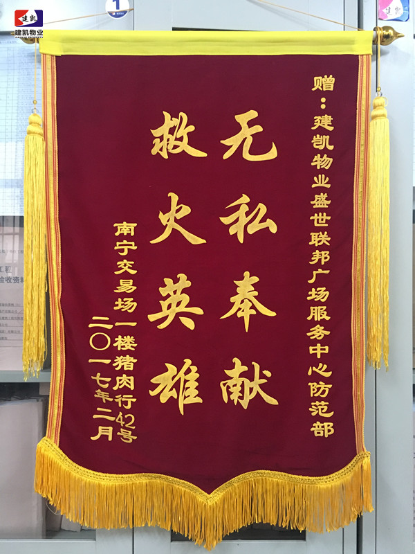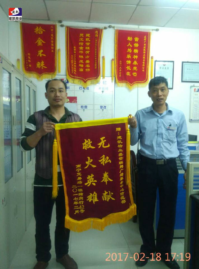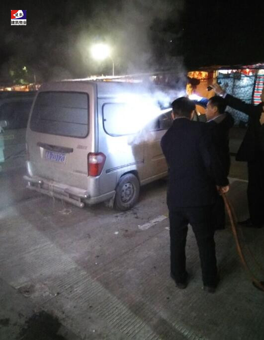 由广西建凯物业所管理的盛世联邦广场,2017年1月25日早上6:40左右,防范员郭某做交接班巡查中发现盛世联邦商场外围上海路停驻的一辆五菱微型车冒着浓烟。该车门窗均已上锁,而且周边并无车主。郭某立马上报消控室,值班班长高某果断组织防范人员对着火车辆破窗施救。